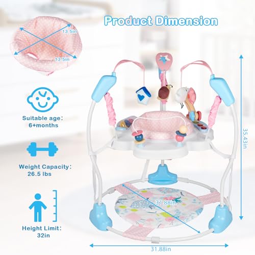 3-level Height Adjustment: This baby jumpers and bouncers is designed with 3 adjustable heights , suitable for babies under 32″ in height and under 26.5 lbs in weight. You can simply pull the strap to adjust on the base of your kids. Before use, please check child’s foot position to ensure proper height adjustment.