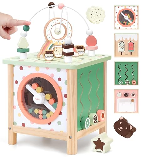 7-IN-1 BUSY CUBE – Adorned with dessert-inspired activities including bead maze, shape sorter, block race, ice cream flip board puzzle, easy bake oven, animal slide rail, and spinning sound wheel.Baby Activity cube engages young minds and encourages independent exploration