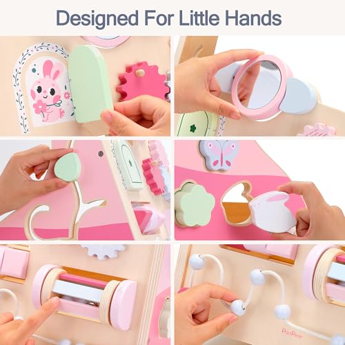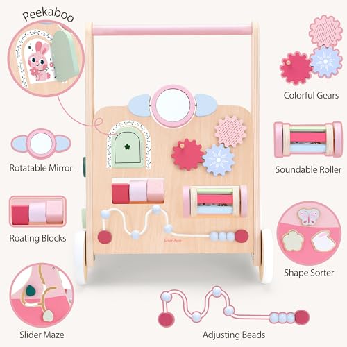 PairPear Wooden Baby Walker Push and Pull Learning Activity Walker, 8-in-1 Montessori Busy Board Push Walker Wooden Activity Center Toys for Boys and Girls 12m+ (Pink Rabbit)