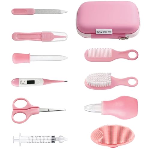 PandaEar Baby Healthcare and Grooming Kit, Baby Safety Set Baby Comb, Brush, Finger Toothbrush, Nail Clippers, Scissors, Nasal Aspirator, Baby Essentials Nursery Care Kit (Pink)
