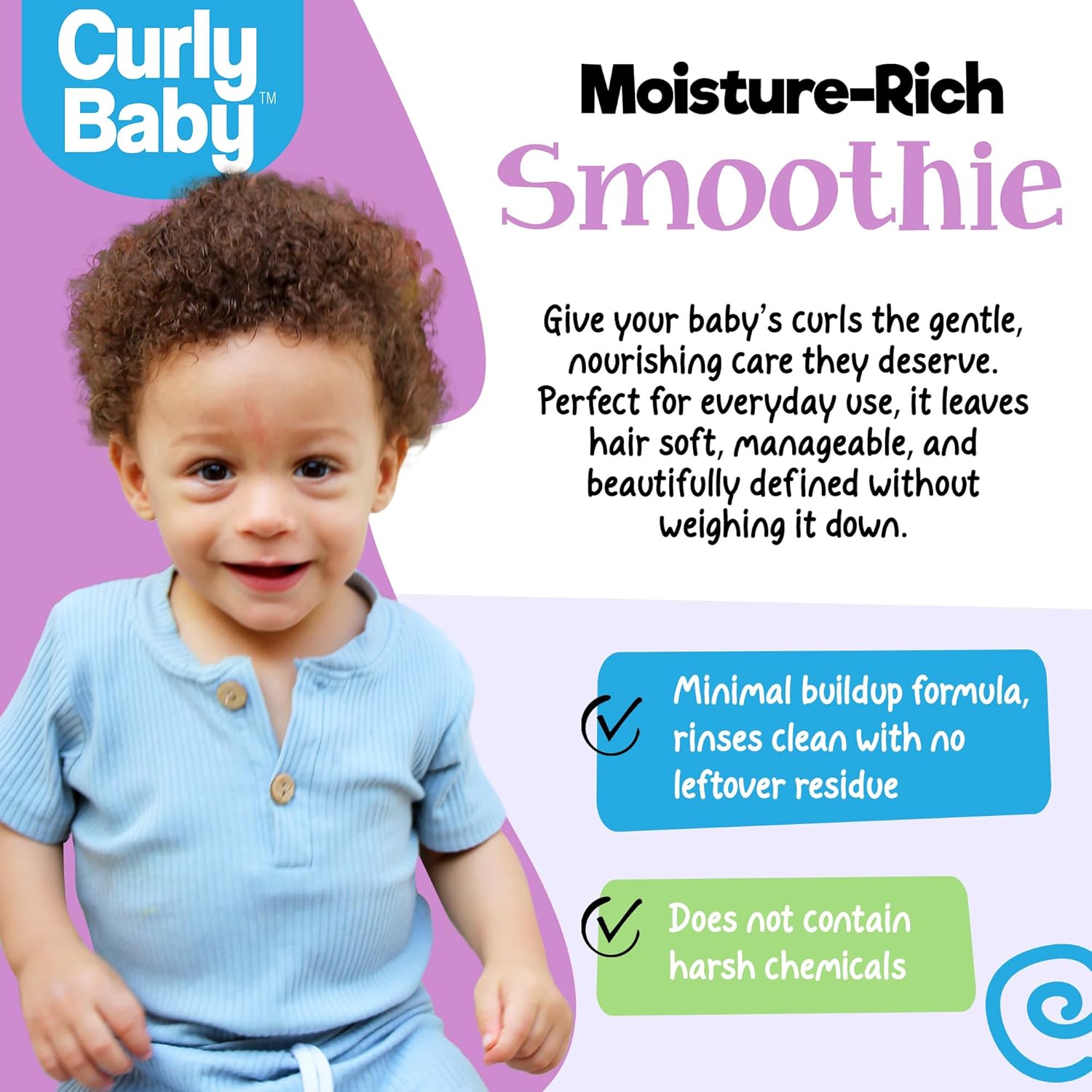 PERFECT FOR ALL CURL TYPES: Whether your baby’s hair is curly, coily, or wavy, CurlyBaby Curly Moisturizing Smoothie is formulated to meet their unique needs. This versatile leave-in conditioner hydrates and softens, delivering salon-quality results right at home.