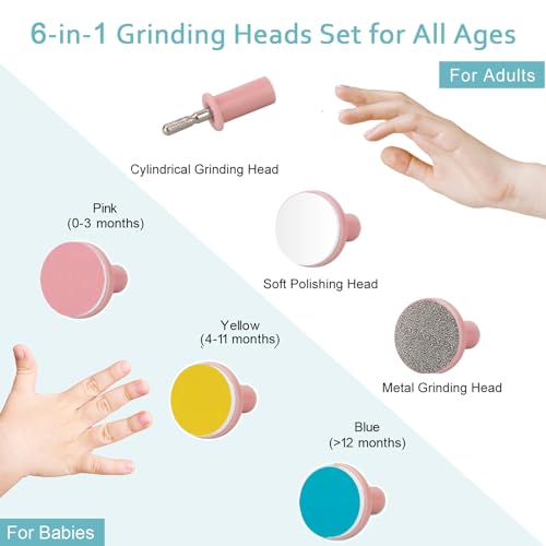 [6-in-1 Manicure Set]: This baby nail clippers come with 6 different granding heads, 3 for baby and 3 for adults. You can choose the cuitable grooming heads for variable ages,available for newborn, baby and adults