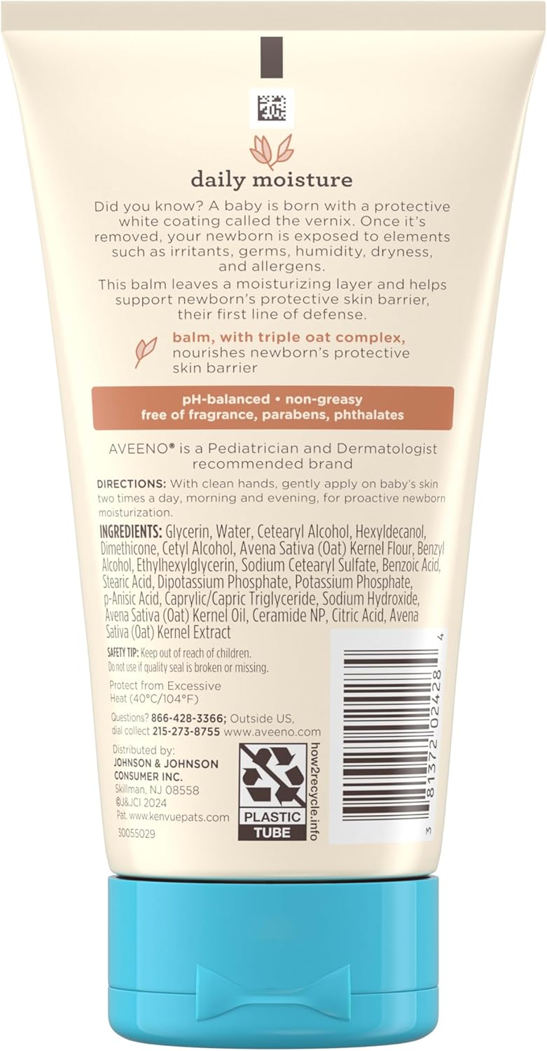 5-ounce tube of Aveeno Baby Daily Moisture Healthy Start Balm. Made with prebiotic oat, balm leaves a nourishing layer to help moisturize baby’s developing skin. Gentle enough to start using at day 1 of life for proactive skincare