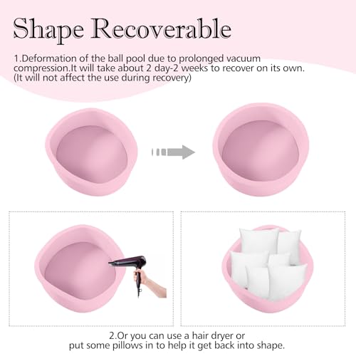 【Vacuum-Packed】The kiddie ball pit expands upon unboxing but it will not show a perfect circle immediately, It may take 2 days–3 weeks to fully regain its round shape. A hairdryer or by stuffing the pit with pillows/blankets will help a lot to shape recovery(the recovery process will not affect the use).
