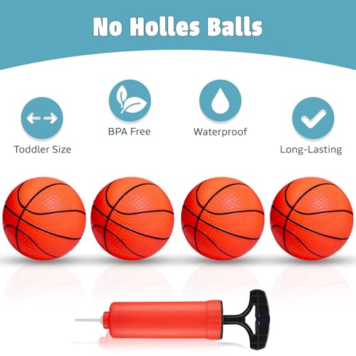 FUN & DURABLE: Our toddler sports toys are made from high-quality materials. This bath toys for kids set comes with 4 soft (no holes) basketball balls, 1 easy-to-use basketball hoop, and 1 air pump for the toy balls. We pride ourselves on excellent customer service.