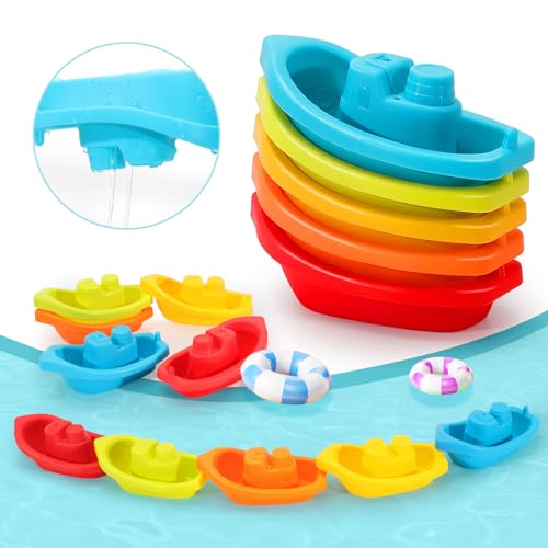 Bath Toys Value Bundle: The bathtub toys set includes 1 pcs duck waterfall bath toy, 2 pcs animal spoons toy, 4 pcs sea animal stacking cups (one cup with spinning propeller), and 5 pcs floating bath boats. Multi-color, unique designs with cute animal characters can catch babies’ attention, encouraging toddlers and babies to learn and play during bath time.