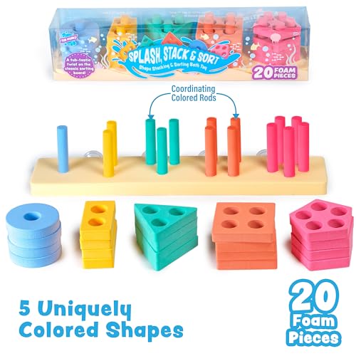 SPLASH, STACK & SORT: Our shape sorter bath toy includes 20 foam pieces – 5 colorful shapes each with 4 pieces! Match shapes & colors on the sorting board’s colored rods for a fun-filled toddler bath!