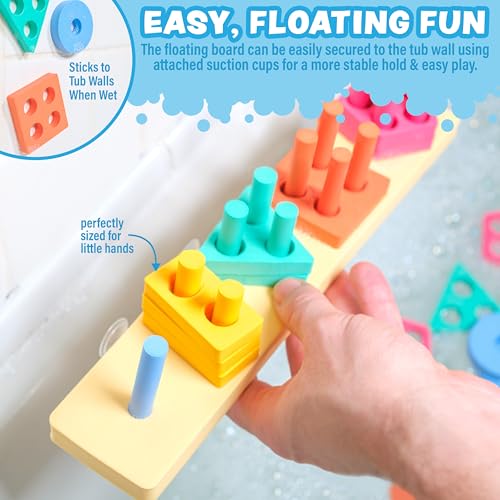 20-PIECE SHAPE STACKING BATHTUB TOY: Includes 20 foam pieces in 5 colorful shapes—circle, rectangle, triangle, square & pentagon—and a durable sorting board with coordinating rods for stacking and suction cups for secure attachment to the bathtub or tile—ideal for kids bath toys!