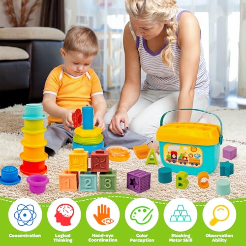 Montessori Baby Toys for Ages 6–18 Months with Sensory Shape Sorter Matching Game Toy Stacking Ring Soft Building Blocks Developmental Learning Toys for Toddlers 1+ Year Old