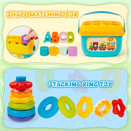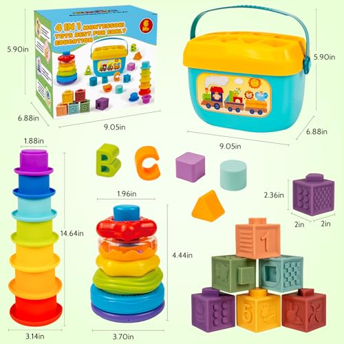 4 IN 1 MONTESSORI SENSORY TOY SET: Our 28 individual pieces for babies 6-12-18 Month and up baby toys come with 9 PCS sensory sorter shape matching toy set, 6 different colored building blocks, 7 PCS rainbow-colored stacking cups, 6 stacking rings, the perfect bundle for countless hours of fun!