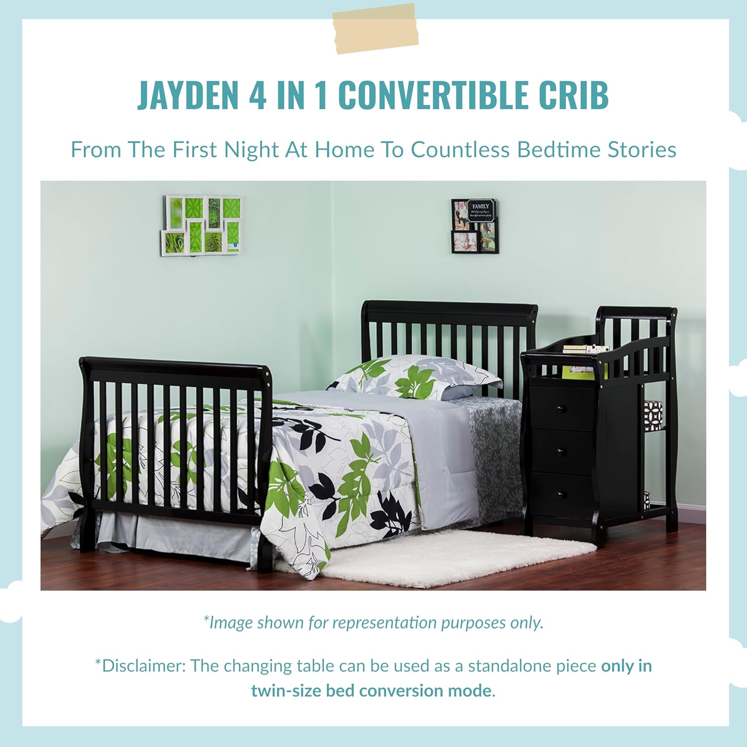 Convertibility options: The Jayden 4-in-1 Mini Convertible Crib and Changer grows along with your child. Starting as a crib, you can convert it into a mini daybed and twin-size bed (bed rails sold separately). Its compact size makes it ideal for small spaces