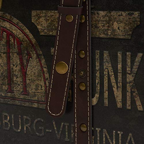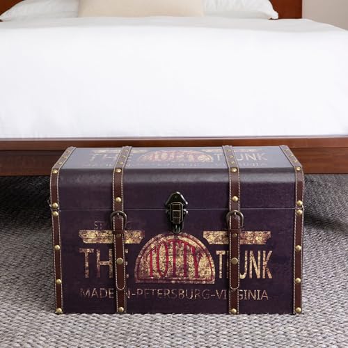 This large decorative storage trunk combines great style and ample capacity to create a functional storage option that need not hide in the closet or attic. The faux decoupage exterior and various style accents accomplish a vintage aesthetic, perfect for any room in need of storage and style. The frame of this trunk is composed of a durable MDF that will protect all the contents. A front clasp with a brass-like finish can be used to securely close the trunk and avoid the build-up of dust. While the side handles are smaller, they help complete the antique look. The outside is made of a distressed cotton canvas, printed in a faux decoupage style. Leather straps that run down the front are studded with metal rivets. This decorative storage trunk is a great piece for the bedroom, living room or stylized office space. The vintage allure makes this trunk perfect for both storage and decoration. Use this trunk to keep seasonal jackets, extra blankets, throw pillows or family heirlooms in one easy-to-access space.