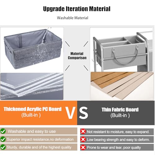 Dividers Design: The diaper cart comes with 4 detachable dividers on the first layer and 2 detachable dividers on the second layer. Each divider can be securely fastened using magic tape, making it the ideal baby storage cart. These compartments allow for organized storage, accommodating all essential baby items such as diapers, wet wipes, bottles, bibs, onesies, changing pads, baby toys, medications, clothing, formula, and more.