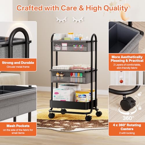 Stylish and Versatile – The unique fabric + metal combination design makes our nursery essentials cart not only practical but also fashionable. A great companion for new mom/dad and babies on the road to growth. More than just a baby storage organizer, our rolling cart can be used in a wide range of household applications as the baby grows up, such as book storage, clothing storage, toy storage, art cart organizer, craft cart organizer and snack cart organizer