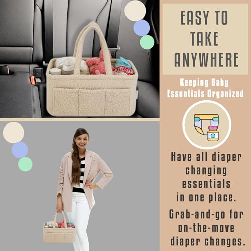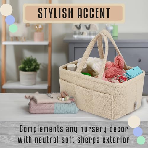 Baby Diaper Caddy Organizer – Soft Beige Sherpa with 3 Removable Compartments & 6 Side Pockets – Perfect Nursery Storage Bin & Car Organizer for Diapers, Baby Wipes, and Essential Supplies.