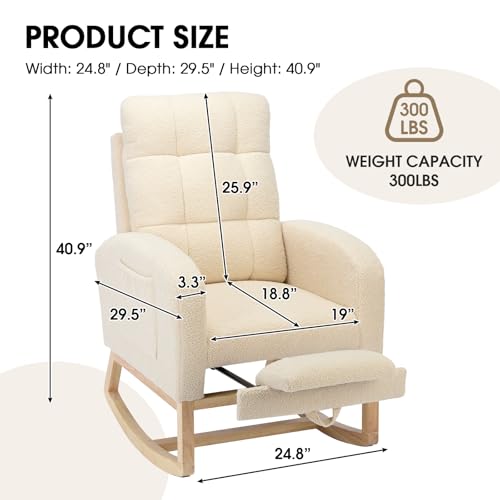 NIOIIKIT Modern Nursery Rocking Chair, Teddy Upholstered Rocking Chair with Footrest, Comfortable Rocker Recliner with Side Pocket, Rocker Glider for Living Room, Bedroom, Nursing Room (Apricot)