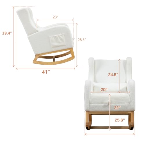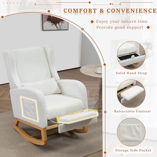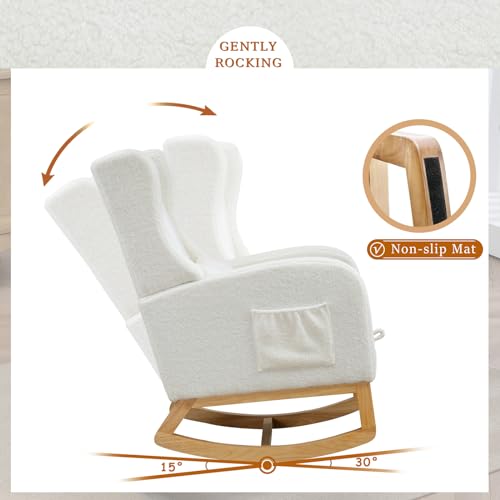 Modern Rocking Chair Nursery Glider, Comfy Rocker Nursery Chair with Foot Rest, Accent Reading Armchair with Pillow and Pocket, Upholstered Lounge Rocker with Solid Wood Base for Relaxing (Ivory)