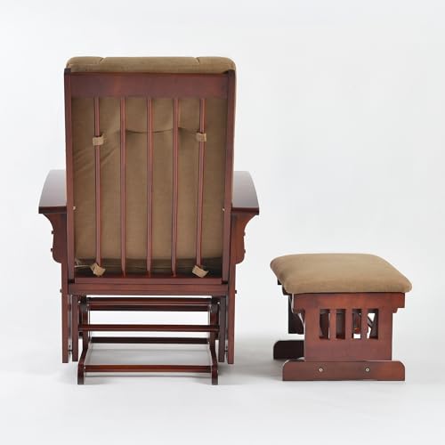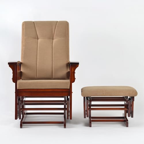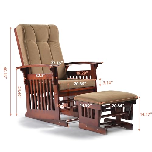 Solid Wood Glider Rocking Chair and Ottoman Set, Rustic Nursery Glider Rocker with Padded Cushion, Smooth Rocking Motion Indoor Living Room Nursing Napping Reading, Reddish Brown+Brown