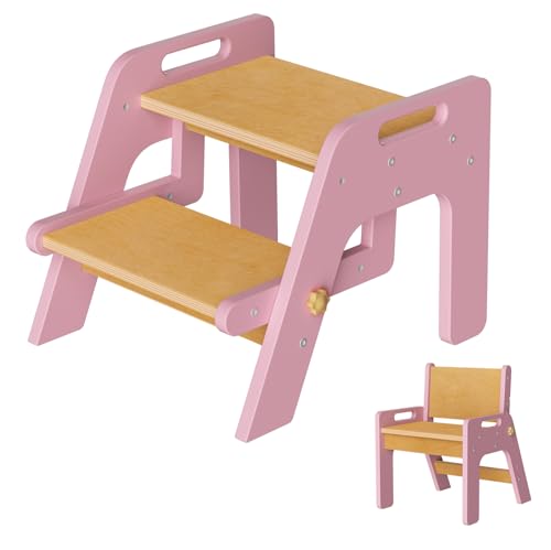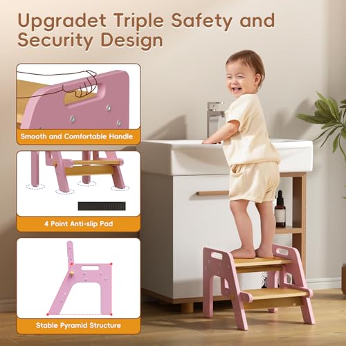 Toddler Step Stool, 2 in 1 Kids Step Stool with Safety Non-Slip Pads and Handles, Wooden Potty Training Stool, Kids Stools Toddler Stool for Bathroom Sink, Kitchen, Bedroom, Nursery, Pink
