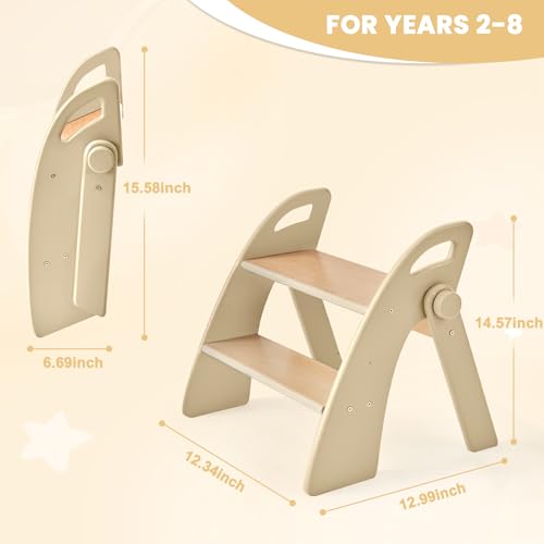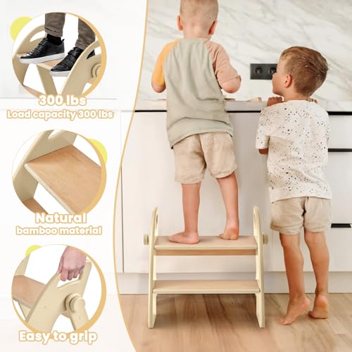 Wooden Step Stool, 300 lb. Load Capacity, with Safety Non-Slip Pads and Handles, Bamboo Step Stool for Bathroom and Kitchen, Children’s Double Height(Log Color)