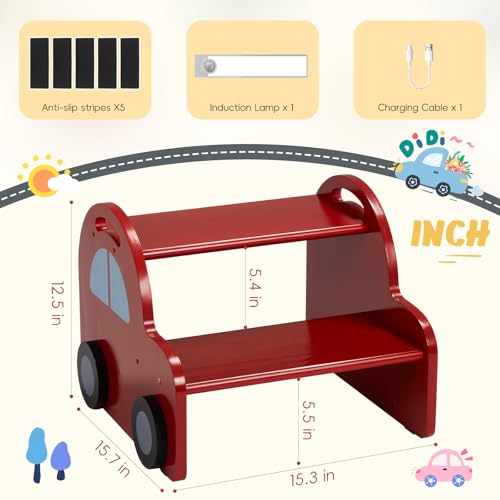 Wooden Toddler Step Stool for Kids, 2-Step Stool for Bathroom Sink and Potty Training, Child Stepping Stool for Kitchen with Safety Non-Slip Pad, Handle and Auto Light