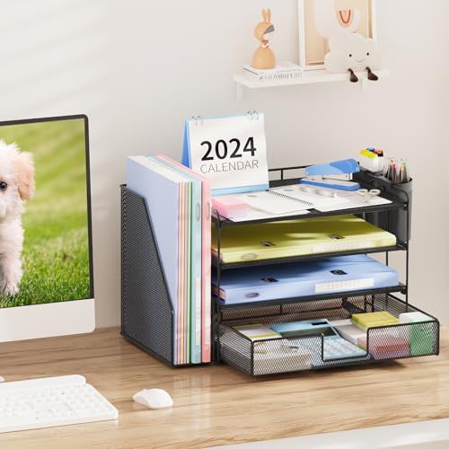 Desk Organizer and Accessories, 4-Tier Desktop File Organizer with Drawer and 2 Pen Holders, Office Desk Accessories, Workspace Organizers for Office Supplies(Black)