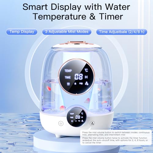 Humidifiers for Bedroom, 3L Tank for 30H 20dB Quiet Mist Time, Dual Nozzles, LED Lights, Smart Timer (2/4/8 Hours), Auto Shut-Off, Perfect for Baby and Large Rooms, (White)