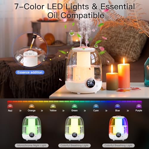 7-Color LED Lights with 3 Adjustable Modes – Create the perfect atmosphere with the built-in 7-color LED lights, featuring three adjustable modes. This not only provides a soothing light but also doubles as a nightlight, enhancing the ambiance of your humidifiers for bedroom