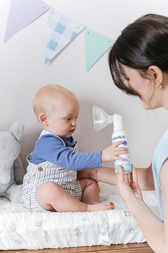 Lasts 50% Longer than other 1.7oz saline mist inhalers: Our quiet, continuous baby saline nasal spray lasts up to 1.5 hours. Designed for gentle, effective baby congestion relief, but it’s also designed for complete ease of use; Coming in a slender can with a convenient, removable mask, this baby saline mist is easy to hold and easy to use.
