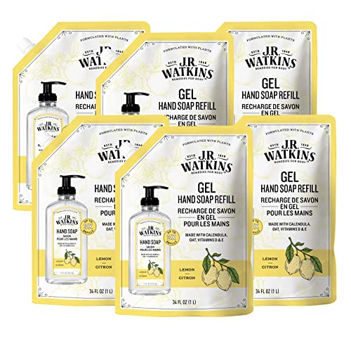 J.R. Watkins Gel Hand Soap Refill Pouch, Scented Liquid Hand Wash for Bathroom or Kitchen, USA Made and Cruelty Free, 34 fl oz, Lemon, 6 Pack