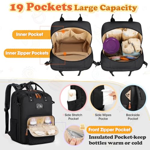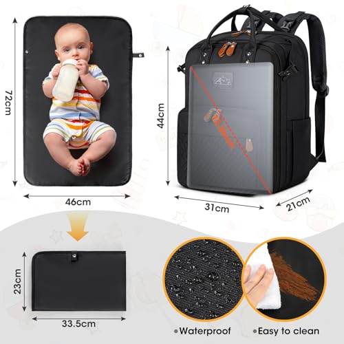 【Spacious & Thoughtfully Organized】Size 31x 21x 44cm, the diaper bag backpack stays organized with 19 functional pockets, including a large main compartment with a wide opening for quick and easy access. Dedicated pockets for diapers, wipes, snacks, and clothes keep everything neatly stored. A 180° opening separate laptop compartment (fits up to 15.6”) makes it perfect for working parents. The included waterproof changing pad (72×46 cm) ensures hygienic diaper changes on the go.