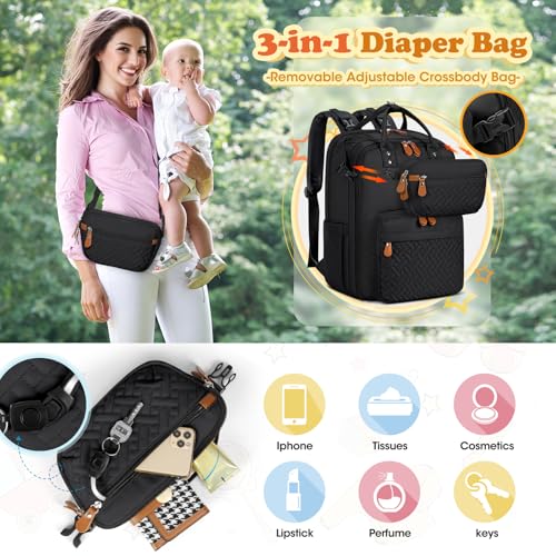 RAINSMORE Diaper Bag Backpack, Large Waterproof Baby Bag with Changing Pad, Detachable Crossbody Bag & Stroller Straps Travel Diaper Backpack for Moms Dads Unisex Baby Essentials Organizer