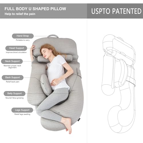 USPTO-CERTIFIED PREGNANCY PILLOW: Measuring 54 inches x 27 inches, this U-shaped maternity pillow is designed to support your entire body. It alleviates discomfort in key areas such as the head, neck, back, legs, and belly, helping you stay relaxed and well-supported throughout your pregnancy.