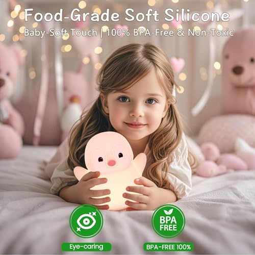 Pink Penguin Night Light,Food Grade Soft Silicone Nursery Nightlight for Baby,LED Squishy Novelty Animal Bedside Lamp,Rechargeable/Dimmable/Timer,Funny Gifts for Kids Girls Adults Teens