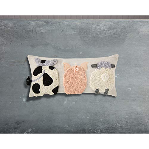 Showcase your farm friends with this hooked farm animal throw pillow. The canvas throw pillow features woven hooked animals. The wool farm animal appliques feature pom and rope detail. The animals featured on this throw pillow include a black and white cow, a pink pig and a gray and white sheep. This throw pillow has a zipper closure.